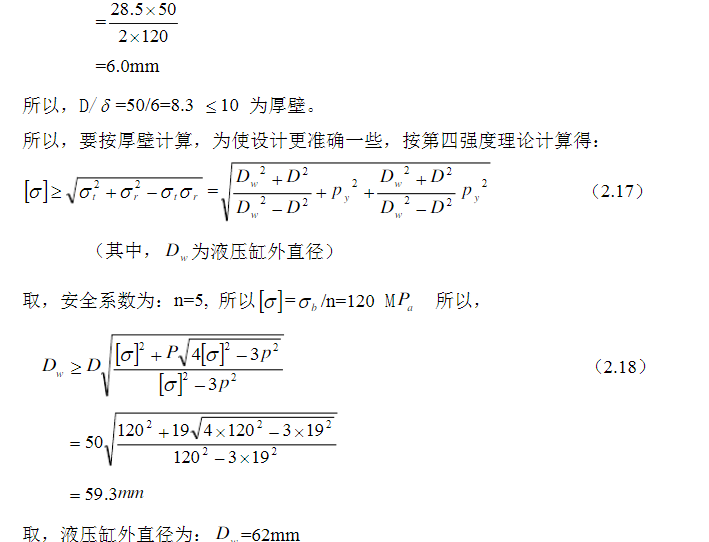為使液壓缸結(jié)構(gòu)較小,先把液壓缸按薄壁計(jì)算。因?yàn)?,D/6210時(shí),為薄壁