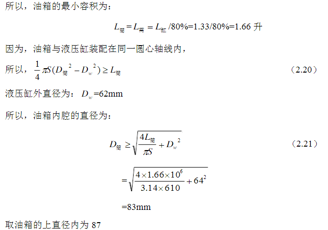 為使液壓系統(tǒng)結(jié)構(gòu)更緊湊,把油簡與液壓缸裝配在同一圓心軸線內(nèi)。要求∶油筒油面的最高高度不超過,油簡高度的80%
