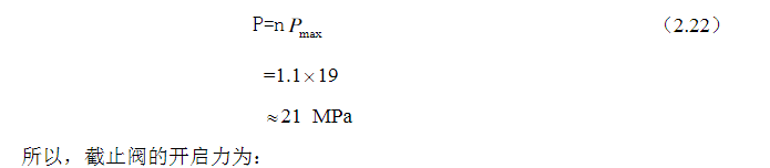 因?yàn)?,液壓系統(tǒng)設(shè)計(jì)的最高壓力為∶Pn-=19MPa 取,截止閥的開啟系數(shù)為∶n=1.1 所以,截止閥的開啟壓力為∶