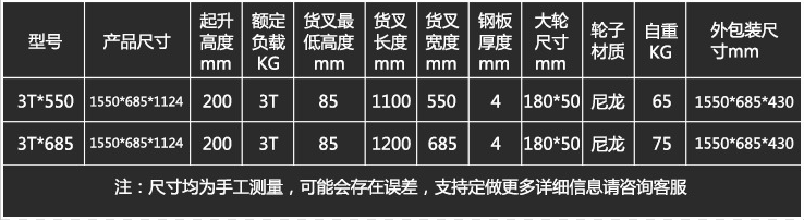 搬運車分為兩種型號:550型和685型,其具體的相關尺寸見上圖所示。其輪子也分為2種,一種是尼龍輪,一種是橡膠輪。尼龍輪適合水泥地面,橡膠輪適合大理石、油漆、環(huán)氧地面。